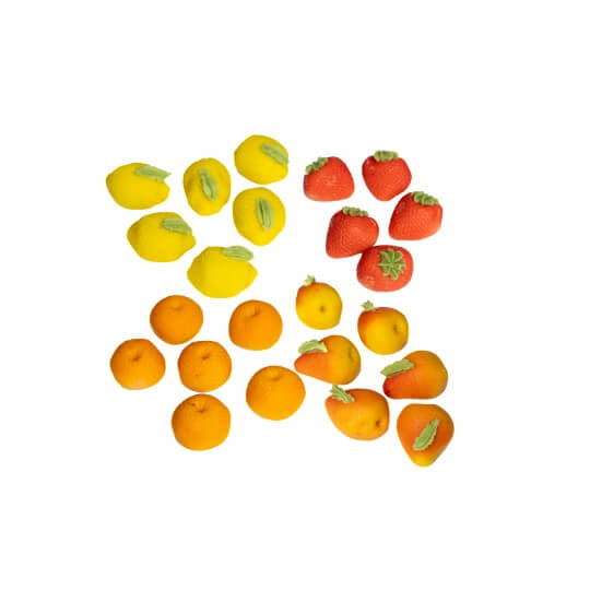 Χειροποίητα αμυγδαλωτά σε σχήμα φρούτων, με αμυγδαλόπαστα και φυσική γεύση φράουλας, λεμονιού, πορτοκαλιού και άλλων φρούτων.